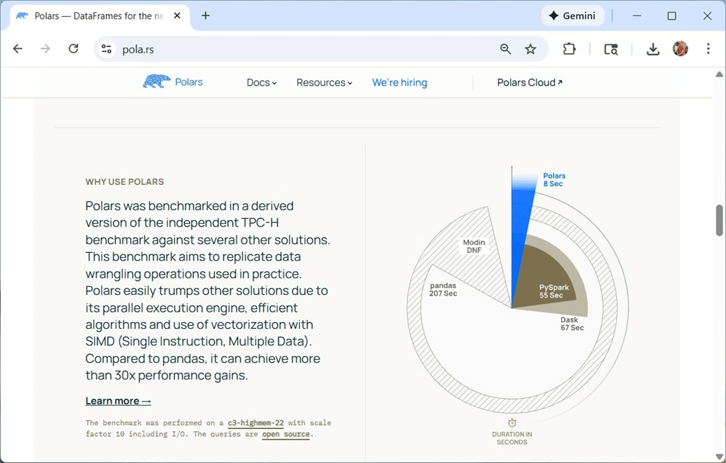 If we peek at the website for this library, we can see how it boasts superior performance over PySpark and Pandas when dealing with the TPC-H benchmark dataset. There are some limitations that we will talk about during this section.