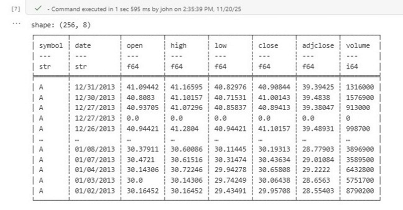 The image below shows that 635,817 records are contained in the Polars dataframe. The look and feel of the output from the print statement is different than Pandas.