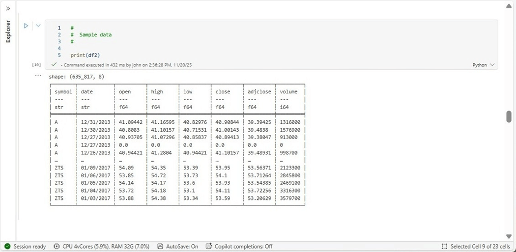 # # 5 - read a single file (3 sec) # import polars as pl path ='/lakehouse/default/Files/stocks/ALL/SNP-5YEARS.CSV' df = pl.read_csv(path, separator='\t', has_header=True) print(df)