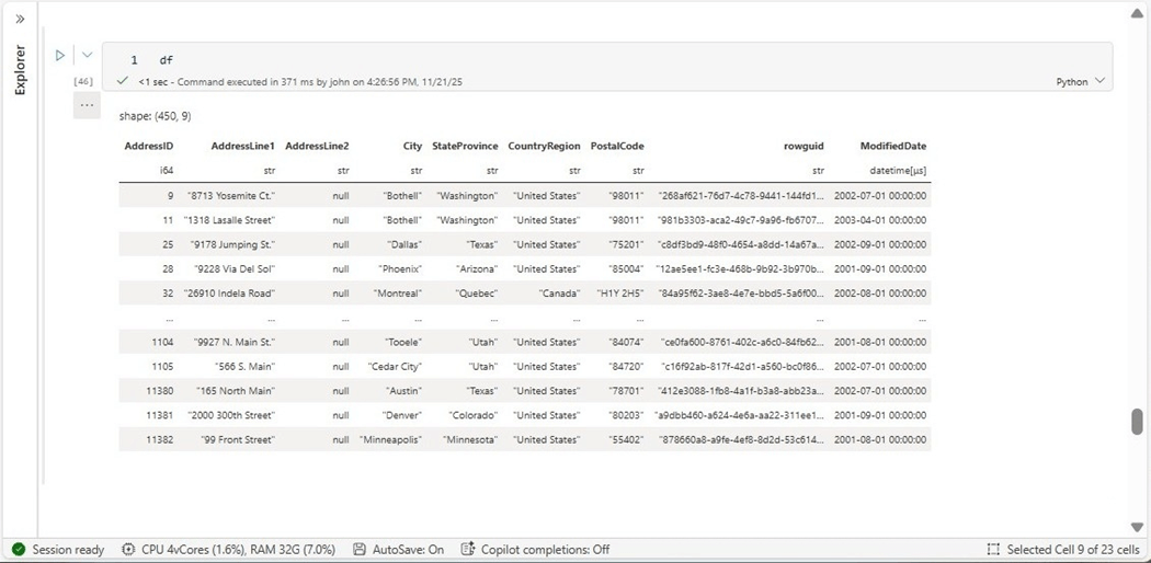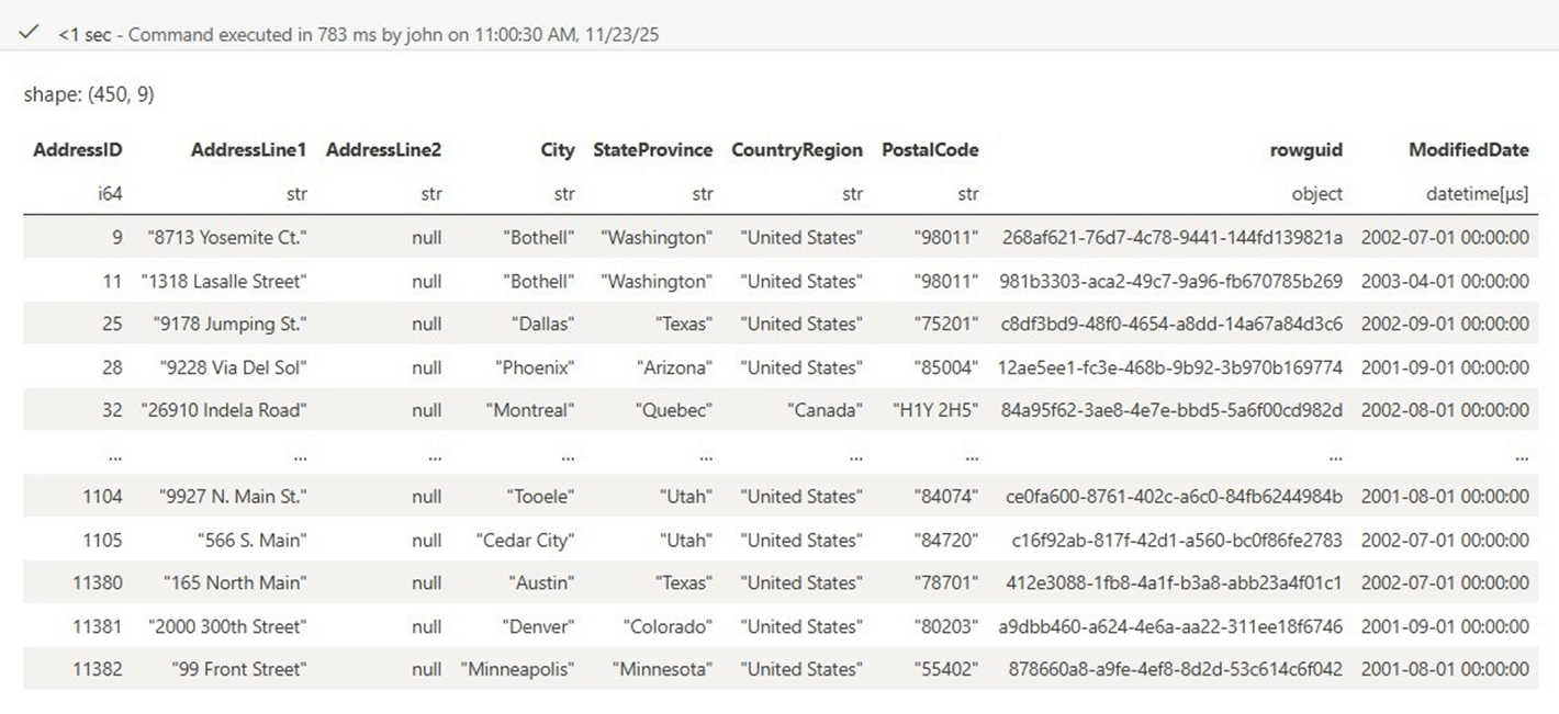 # # 8 - write funtion to read from azure sql server + return polars df # # Connection information ci = "" ci = ci + "server=<your server>.database.windows.net;" ci = ci + "database=<your database>;" ci = ci + "uid=<your user>;" ci = ci + "pwd=<your password>;" # call function df = read_sql_table(ci, "select * from SalesLT.Address", []) # show results df