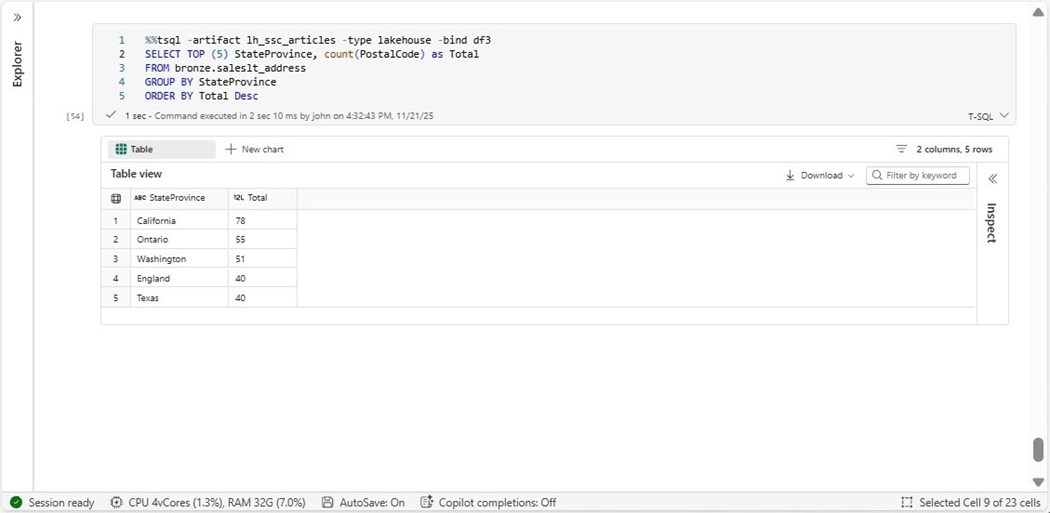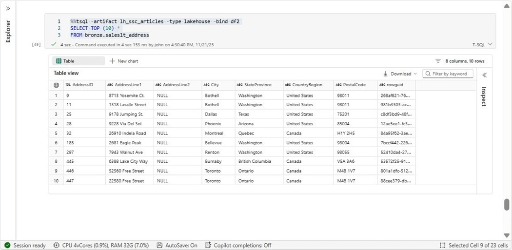 Microsoft has introduced a new magic command (T-SQL) to solve this issue. It takes the artifact name and type as inputs and binds the results to a dataframe variable of your choice. The image below shows the first ten rows of the address table.