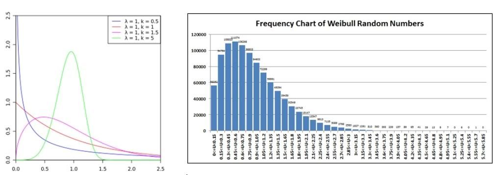 Having worked with the Weibull distribution in university, even going so far as doing a derivation of the Maximum Likelihood Estimator (MLE) for it, my understanding is that it is also quite well-behaved so was a prime candidate distribution for this excursion into NURNs. The Weibull has application in many areas of statistics and engineering, including weather forecasting, survival analysis, insurance, hydrology, reliability engineering (here’s hoping that my professor for that course would be proud) and many others.