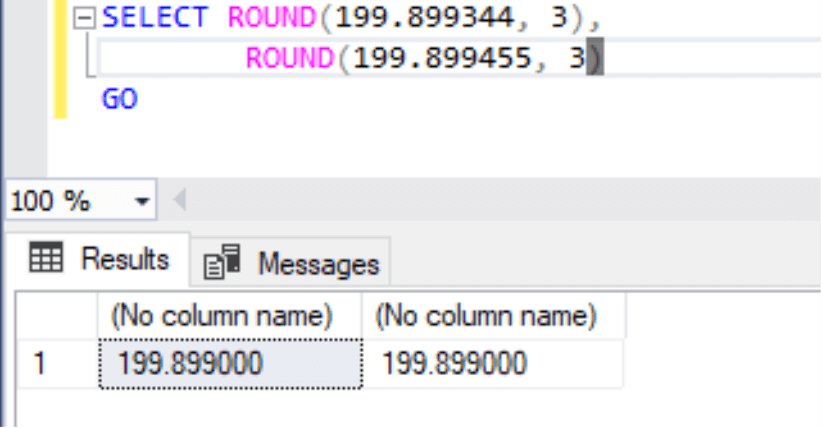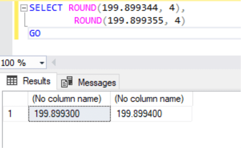GOThe first statement has returned output as 199.899300, meaning the function has rounded the last two digits after 4th digit post decimal values. Let’s read another output in which we have output as 199.899400. Here also value has been rounded after the 4th digit post decimal, but you will notice that the 3rd digit has been changed to 4, whereas it is the same as 3 in the first statement. This is because the SQL ROUND function keeps values the same if the first rounded value is less than 4 whereas it will increase the number when it will be 5 or more.