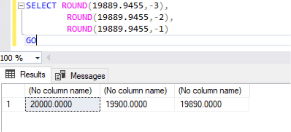 SELECT ROUND(19889.9455,-3), ROUND(19889.9455,-2), ROUND(19889.9455,-1) GO