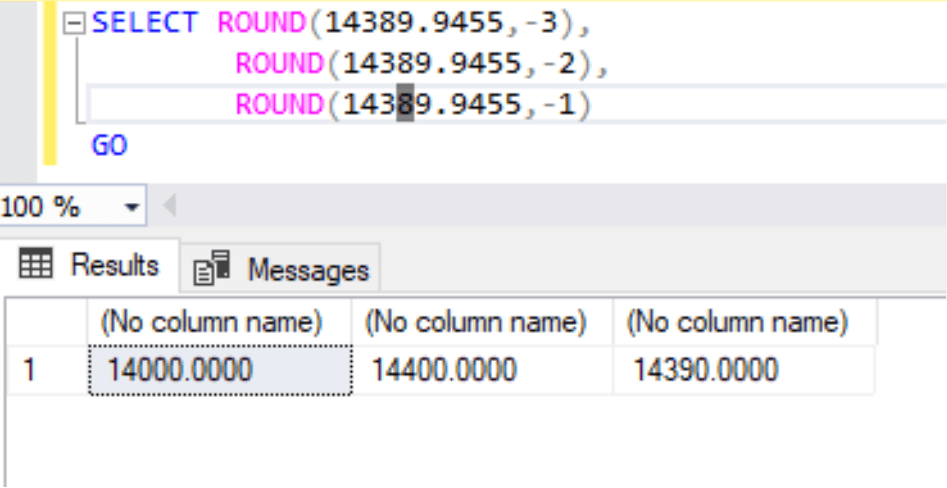 SELECT ROUND(14389.9455,-3), ROUND(14389.9455,-2), ROUND(14389.9455,-1) GO