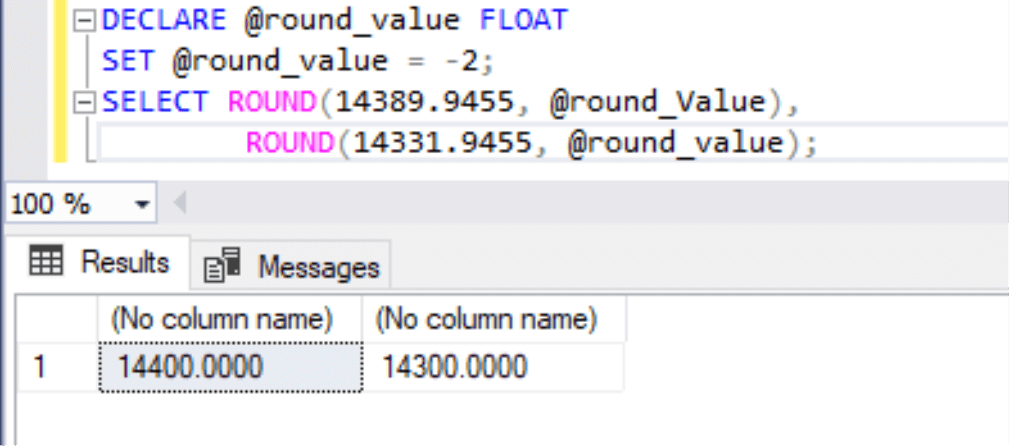 We can analyze the result of the above query in the below image. I used a random number 14331.94555 and set this value to a variable @input_Number, another variable @round_value is declared for the length argument, and I set this value to 3. Next, I passed both variables in this function and got the result. We can see the rounded result as 14331.946 in the below image.