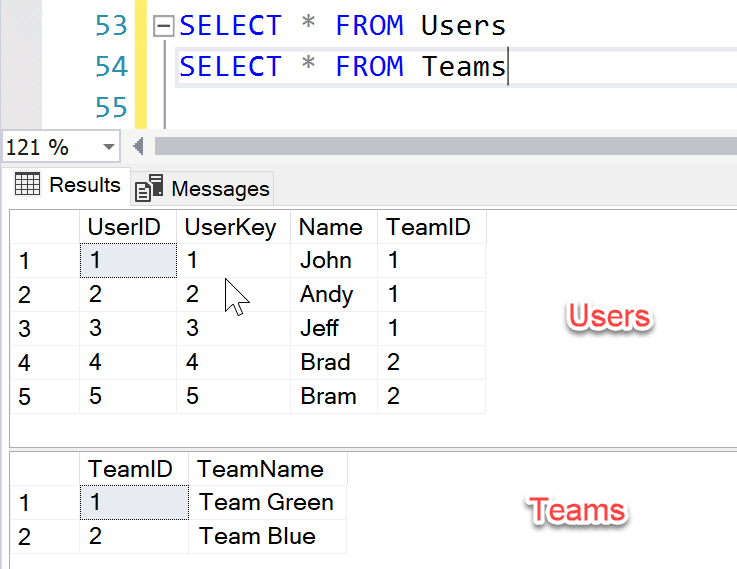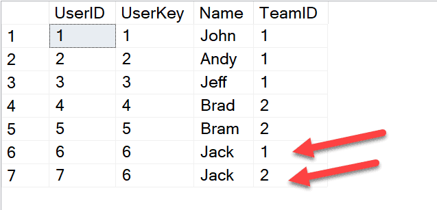 INSERT INTO Users (UserKey,Name,TeamID) VALUES (6,'Jack',1), (6,'Jack',2) GO