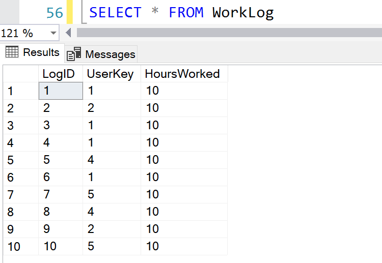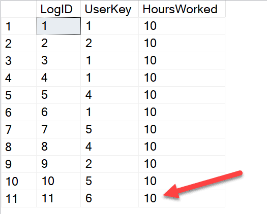 INSERT INTO WorkLog (UserKey,HoursWorked) VALUES (6,10) GO