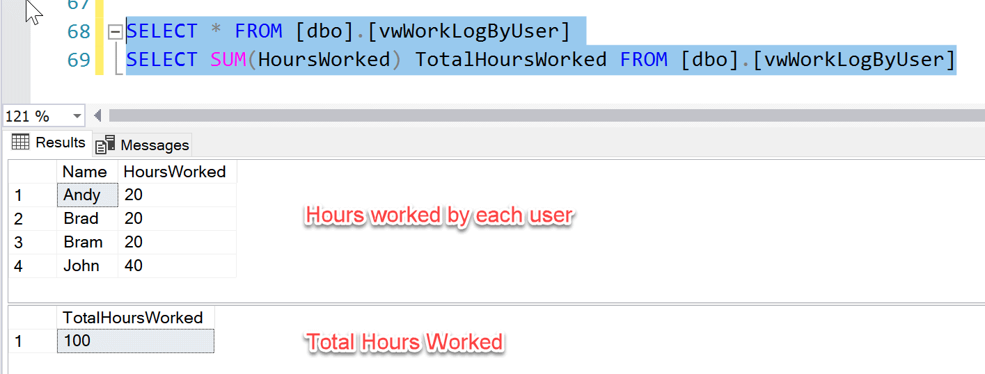 The view used by the application is vwWorkLogByUser. There is also TotalHoursWorked = 100, which is an overall calculation of hours logged by all the users (Fig 3).