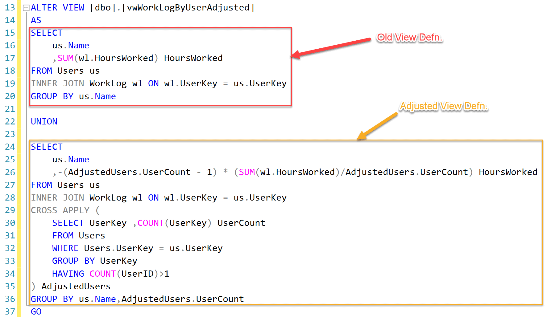 CREATE VIEW [dbo].[vwWorkLogByUserAdjusted] AS SELECT us.Name ,SUM(wl.HoursWorked) HoursWorked FROM Users us INNER JOIN WorkLog wl ON wl.UserKey = us.UserKey GROUP BY us.Name UNION SELECT us.Name ,-(AdjustedUsers.UserCount - 1) * (SUM(wl.HoursWorked)/AdjustedUsers.UserCount) HoursWorked FROM Users us INNER JOIN WorkLog wl ON wl.UserKey = us.UserKey CROSS APPLY ( SELECT UserKey ,COUNT(UserKey) UserCount FROM Users WHERE Users.UserKey = us.UserKey GROUP BY UserKey HAVING COUNT(UserID)>1 ) AdjustedUsers GROUP BY us.Name,AdjustedUsers.UserCount