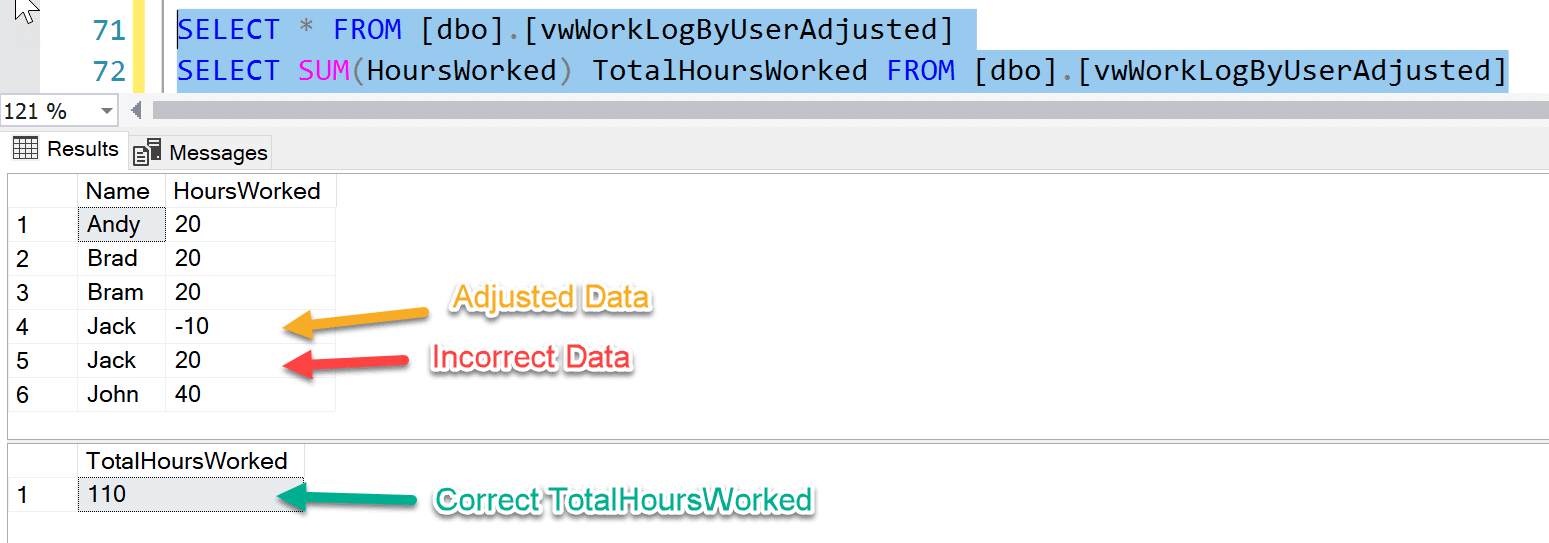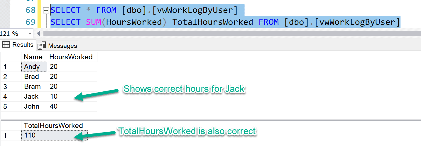Now, when we query this new view, the result set returns an extra row for "Jack", but notice that the value for HoursWorked is "-10". Also, the value for TotalHoursWorked is also "110" which is correct (Fig 9).