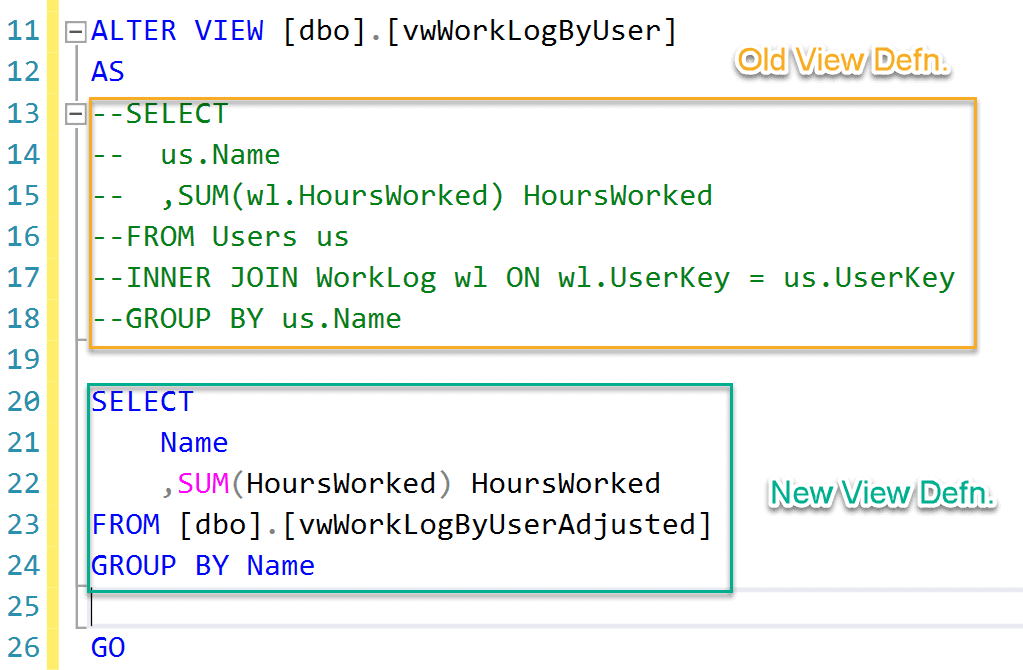 Now, we turned up to the original view and just modified the definition to fetch data from the adjusted view instead of the original underlying tables. The original code is commented and the new code refers to the adjusted view (Fig 10).