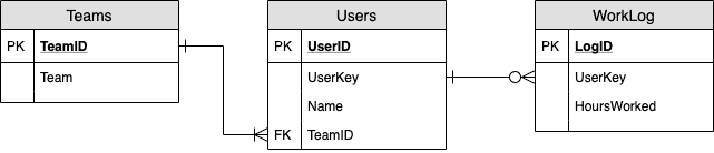 As you can see in the diagram below (Fig 1), one user can be assigned to one or more than one team. Also, one team can contain one or more than one user. Having said that, it means that in the Users table there can be duplicate entries for UserKey and Name for each Team they are assigned to. The WorkLog table, on the other hand, has a one-to-many (or none) relation with the Users table that uses the UserKey to relate to it. This means there might be records in the Users table that have no related records in the WorkLog table. But, for every record in the WorkLog table, there must be one record in the Users table.