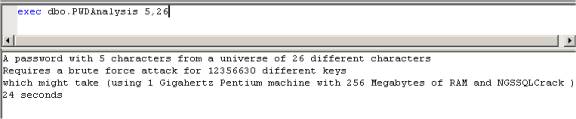 A password with 5 characters and containing only characters from “A” to “Z” (passwords are not case sensitive) would have sizePWD=5 and sizeUniverse=26