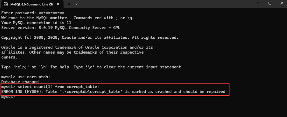 mysql> use corruptdb; Database changed mysql> select COUNT(1) as Computed from corrupt_table;