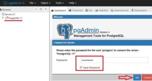 To connect to your newly installed local PostgreSQL 11 server in your server browser, click on “PostgreSQL 11”. This will launch the “Connect to Server” window, where you need to enter the password of the system user postgres, the password that you entered when installing PostgreSQL. Enter the password, tick “Save Password” to save the password, and each time you do not enter it, click “OK”.