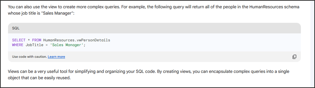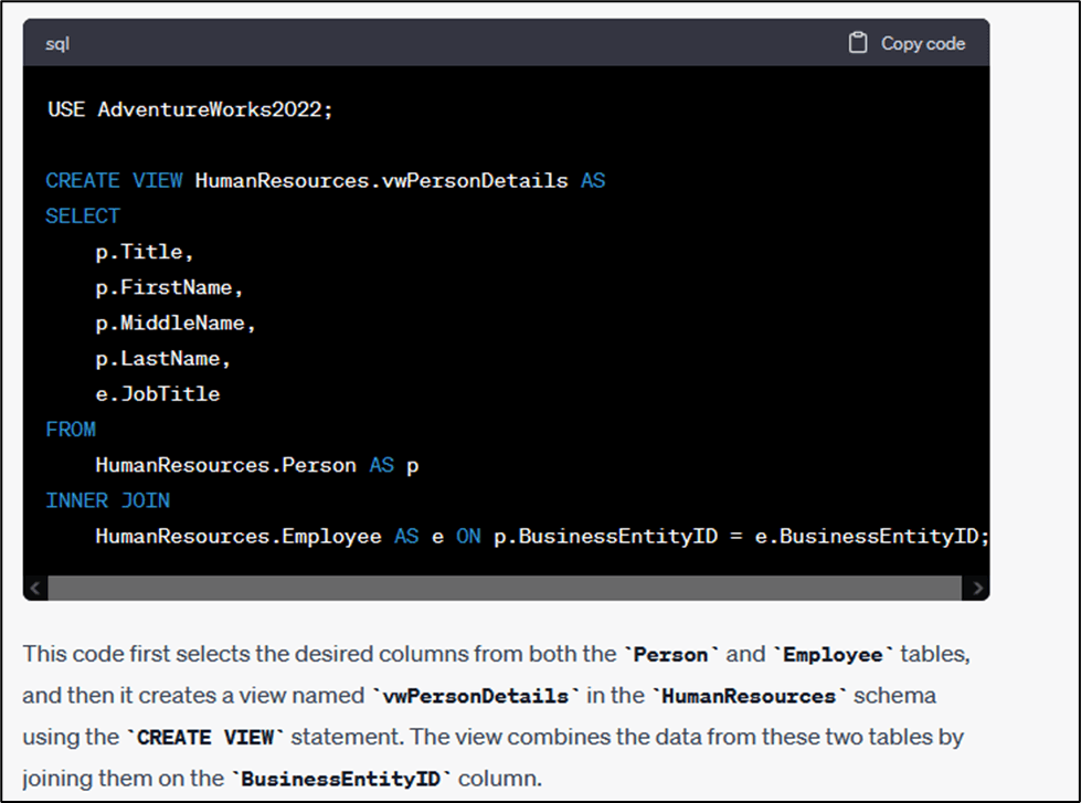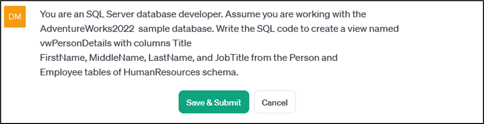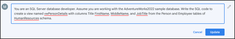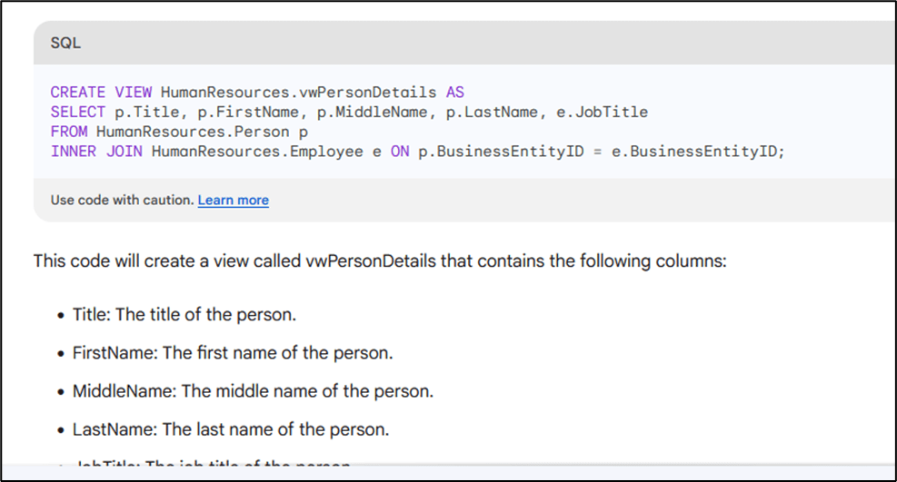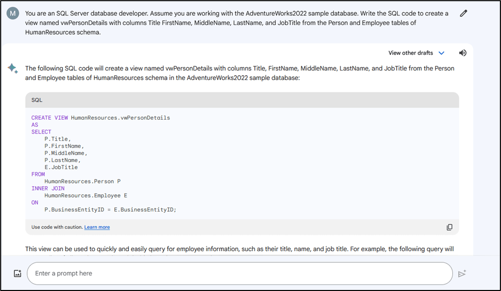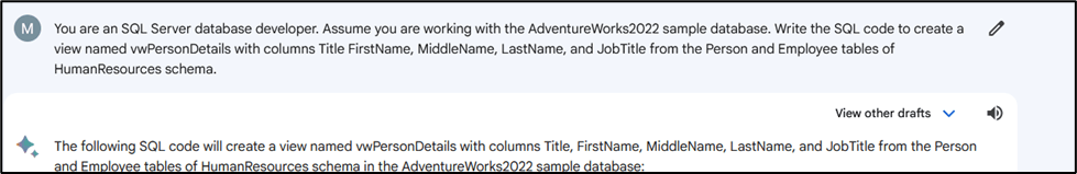 Sample Prompt: You are an SQL Server database developer. Assume you are working with the AdventureWorks2022 sample database. Write the SQL code to create a view named vwPersonDetails with columns Title FirstName, MiddleName, LastName, and JobTitle from the Person and Employee tables of HumanResources schema.