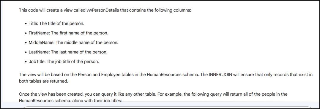 Similar to ChatGPT, Google Bard also gives you a detailed explanation of the SQL code, however its explanation is far more elaborate as compared to that of ChatGPT's.