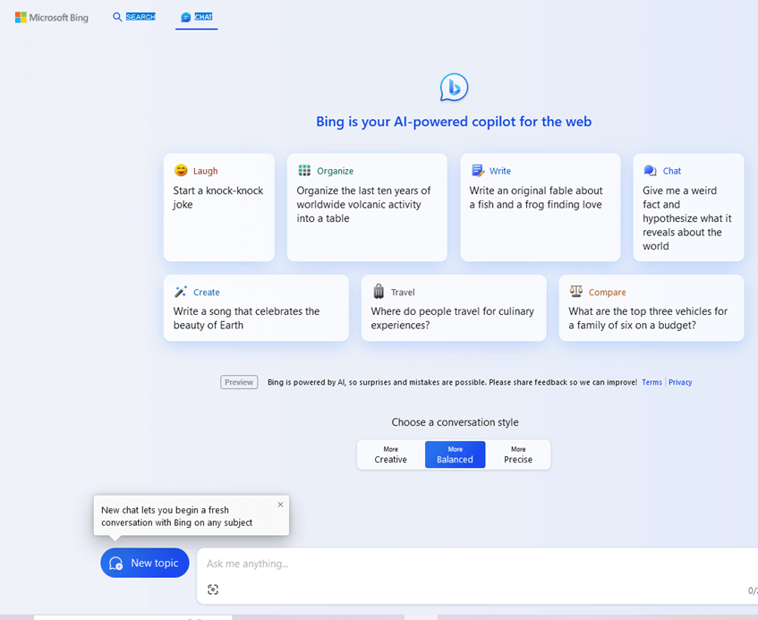 Launch Bing.com on any browser such as Chrome, Firefox or Microsoft Edge. Once the page is loaded, click Chat on the top left corner. Bing Chat appears on the screen.