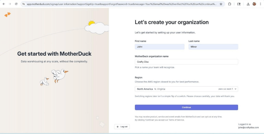 You can create a free MotherDuck account which will last for 21 days. The screen shows the Warehouse service is running in the North Virginia data center of AWS. The only other AWS offering is in Frankfurt Germany.