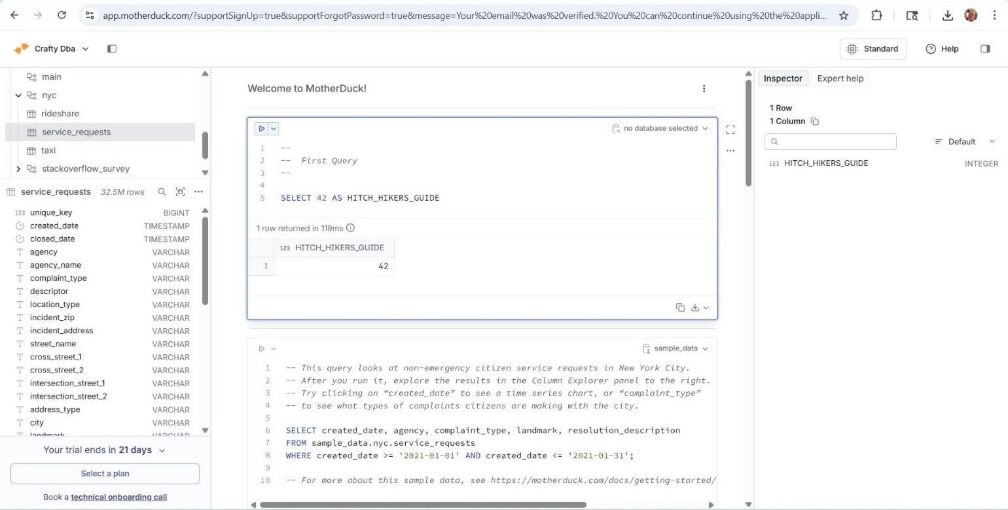 The cloud offering has several built-in sample ducklings. Please see the left panel of the image below. The center window has a sample query for the NYC city database for 311 service requests. We can see both the query output as well as a data profile of the output.