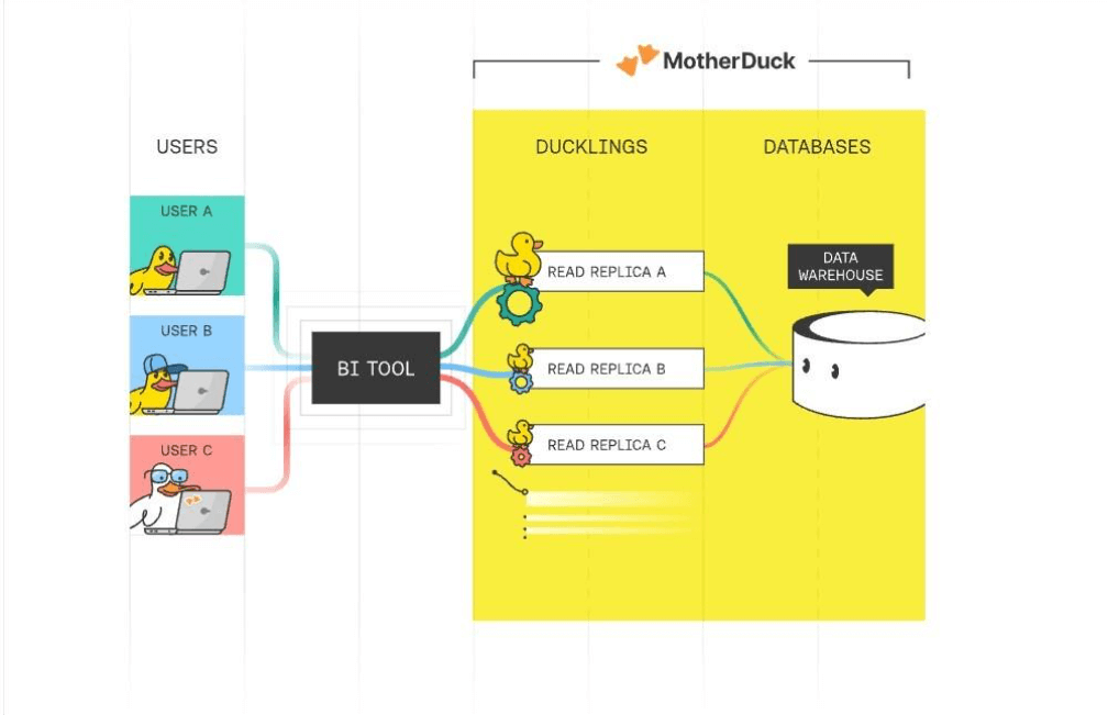 What is a duckling? The in-cloud warehouse offering allows each user to have a read-only processing space (duckling) to query the warehouse. This isolates the users when executing queries.