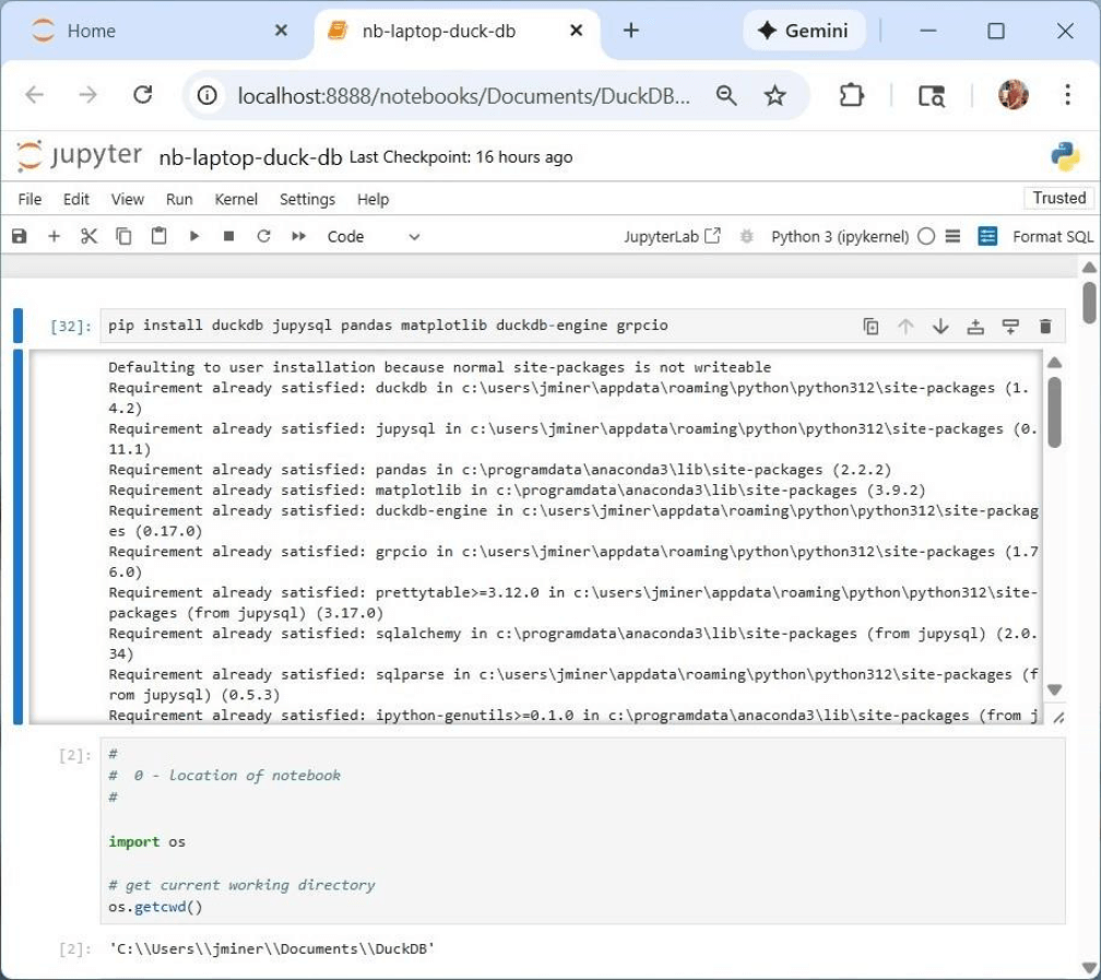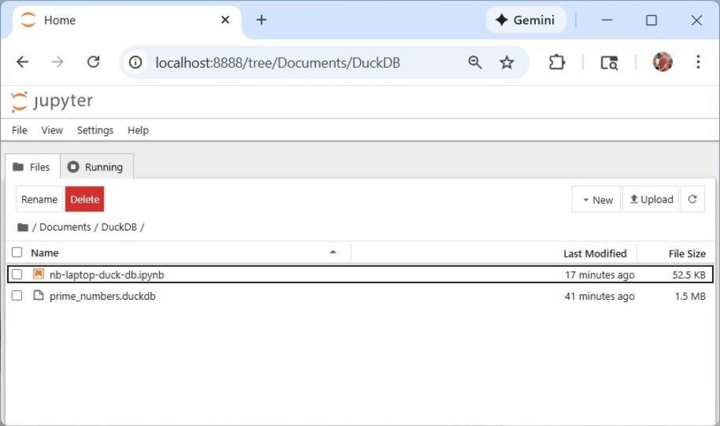 A command shell will open with the Jupyter Notebook processing running in the background. The default web browser will load with the development environment. Under the documents folder, I created a DuckDB folder for this code exploration. It contains both an interactive Python notebook as well as a DuckDB database file.