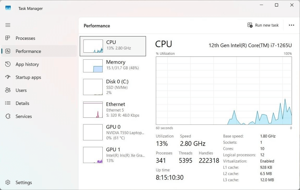 Because this environment is running locally, we need to know where files are stored. The second cell has code to find the working directory for Jupyter notebooks. At this point, I do not know if breaking a problem into pieces (parallel execution) will run faster than one process (serial execution)? We can use the performance section of the task manager to see how many computing cores we have to work with.