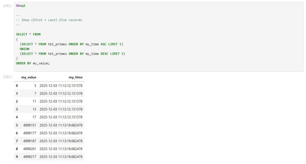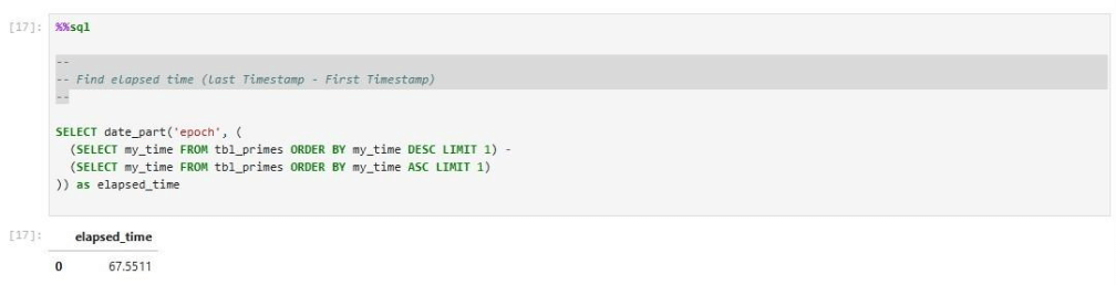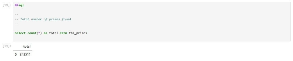return df_resultNow that we have ways to read and write data using ANSI SQL, we need to focus on how to determine if a single number is prime and how to inspect a range of numbers for primes. The function below is called is_prime. It uses the Sieve of Eratosthenes to find prime numbers.