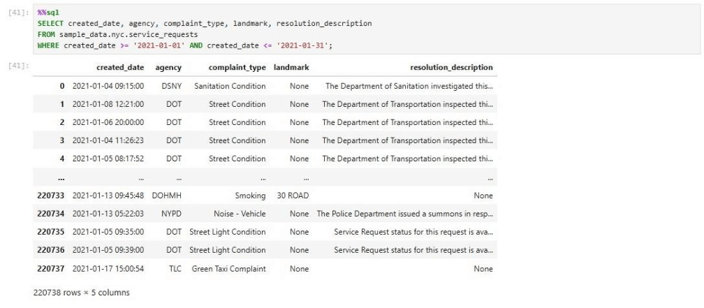 We can execute the same sample query against the 311 database that we did with the in-cloud service. The same number of rows is shown below in the result set.