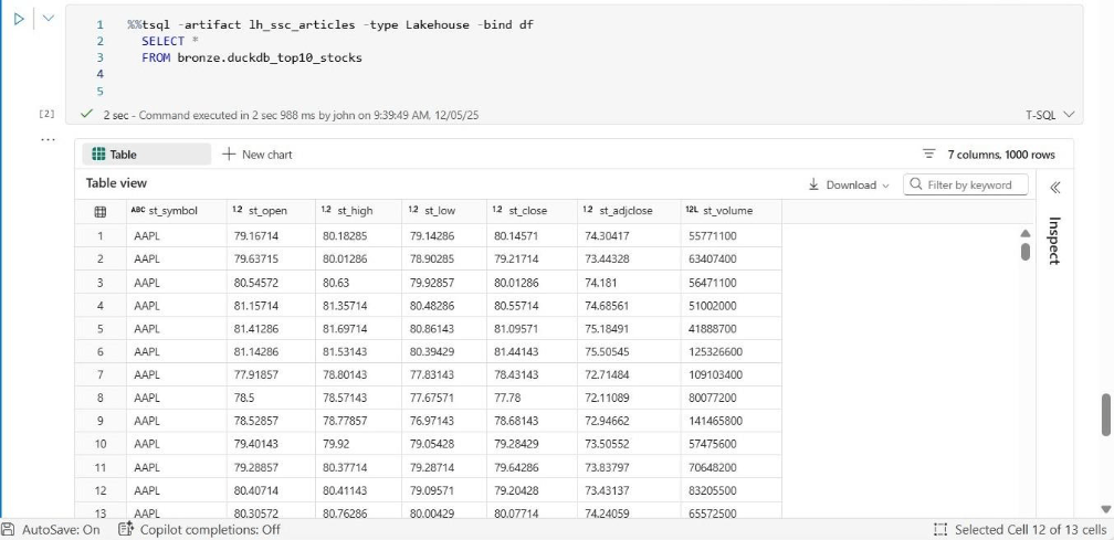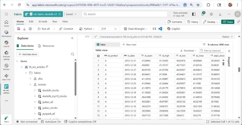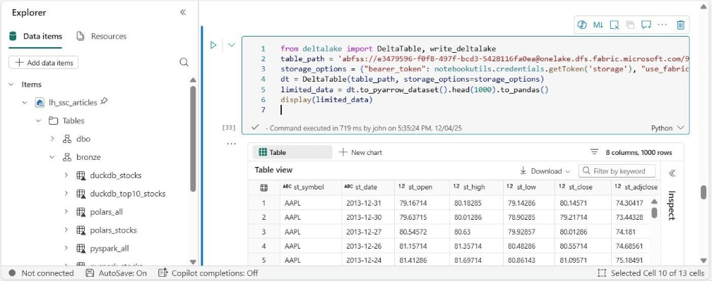 # # # 7 - Save data for top 10 companies in 2025 # # please note tesla was not on the list until 2020 # add libs from deltalake import write_deltalake # make sql stmt stmt = """ select * from stocks where st_volume != 0 and st_symbol in ( 'NVDA', 'AAPL', 'MSFT', 'AMZN', 'GOOGL', 'GOOG', 'AVGO', 'FB', 'TSLA', 'BRK-B' ) """ # get dataframe pdf4 = con.execute(stmt).fetchdf() # remove index pdf5 = pdf4.reset_index(drop=True) # must be adls path path = "abfss://e3479596-f0f8-497f-bcd3-5428116fa0ea@onelake.dfs.fabric.microsoft.com/926ebf54-5952-4ed7-a406-f81a7e1d6c42/Tables/bronze/duckdb_top10_stocks" # over write write_deltalake(path, pdf4, mode='overwrite') # Close the connection con.close()