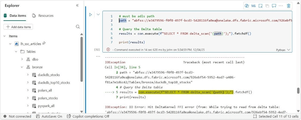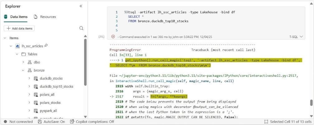 Let’s try using the TSQL magic command that is available in Fabric Python Notebooks. This function uses the SQL endpoint but generates an error also.