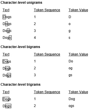 The concept of character-level NGrams is best explained through example so let’s split the word, “Dogs” into character-level unigrams, bigrams and trigrams.
