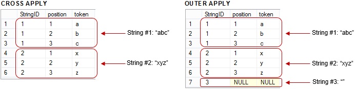 Unlike CROSS APPLY, OUTER APPLY returns a NULL value for the empty string (where StringID = 3).