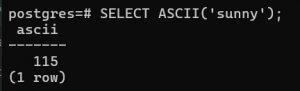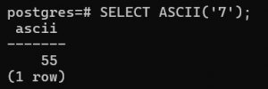 The numeric value of the leftmost character of the string str is returned. 0 is returned if the string passed is empty, NULL is returned if string passed is NULL. Characters with numeric values from 0 to 255 are worked on by ASCII().