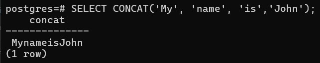 SELECT CONCAT('My', 'name', 'is','John')Example: