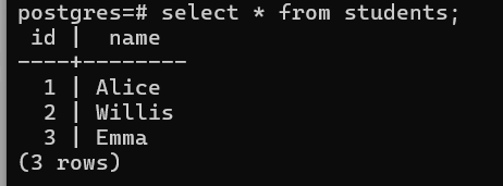 The PostgreSQL ASCII() function is simple but very useful in some practical scenarios. Let us consider the following table students which contains the id and name of school students,