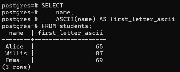 Now there is a need to get the ASCII value of the first letter of each student. We can use the following query to get the result.