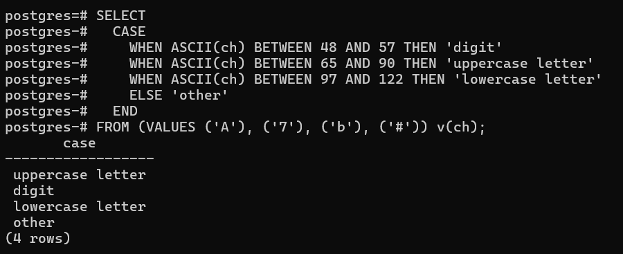 WHEN ASCII(ch) BETWEEN 97 AND 122 THEN 'lowercase letter'