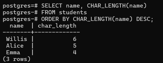 SELECT name, CHAR_LENGTH(name) FROM students ORDER BY CHAR_LENGTH(name) DESC;