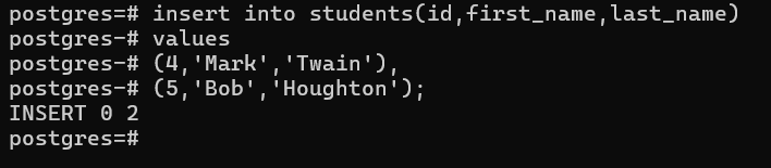 insert into students(id,first_name,last_name) values (4,'Mark','Twain'), (5,'Bob','Houghton');