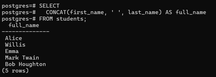 SELECT CONCAT(first_name, ' ', last_name) AS full_name FROM students;