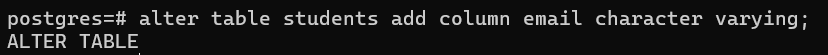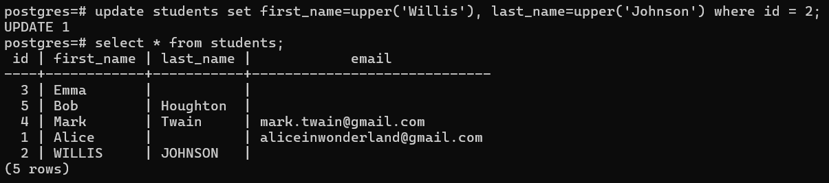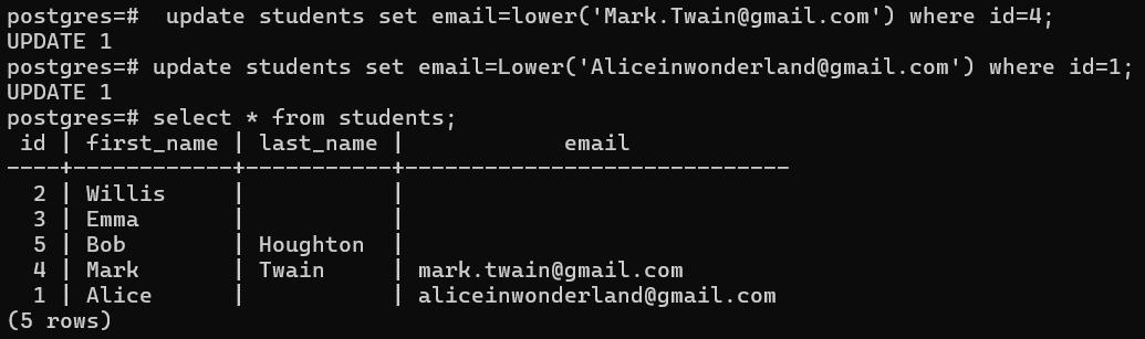 postgres=# update students set email=Lower('Aliceinwonderland@gmail.com') where id=1;UPPER(str)