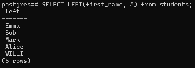 update students set first_name=upper('Willis'), last_name=upper('Johnson') where id = 2;LEFT(str,len)