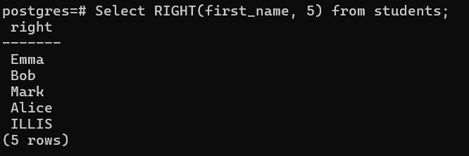 Similar to the LEFT() function, the RIGHT() function is used to extract the last 5 letters of the text.