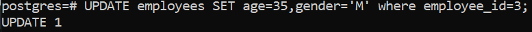 UPDATE employees SET age=35,gender='M' where employee_id=3;
