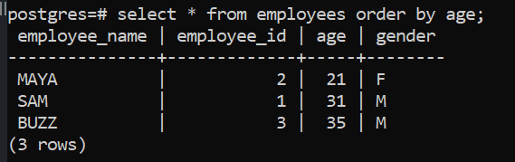 In this query, we see that the results will be sorted on the column age and in ascending order.