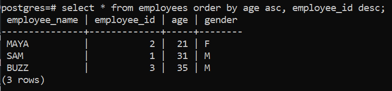 select * from employees order by age asc, employee_id desc;
