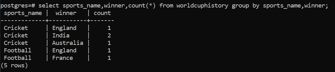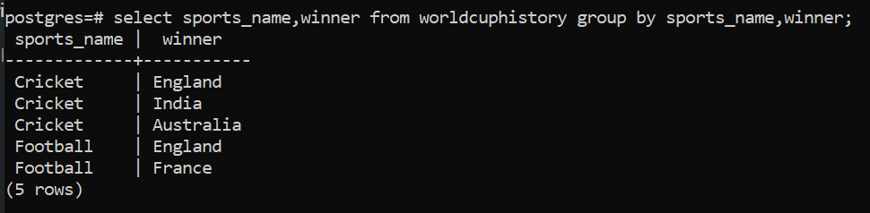 In order to achieve this we add a GROUP BY clause with respect to the column 'sports_name' and winner. Internally, to begin with two groups are created one each for Cricket and Football and then based on these groups the next set of groups with respect to the column 'winner' are created.