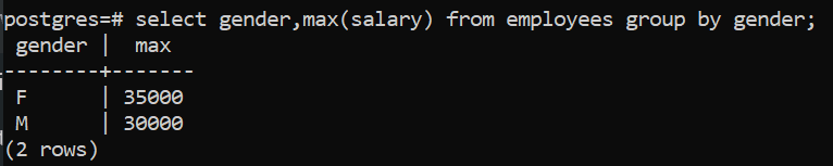 Similarly if we want to get the maximum salary amongst all male and female employees, we can use the Max() function as shown below: